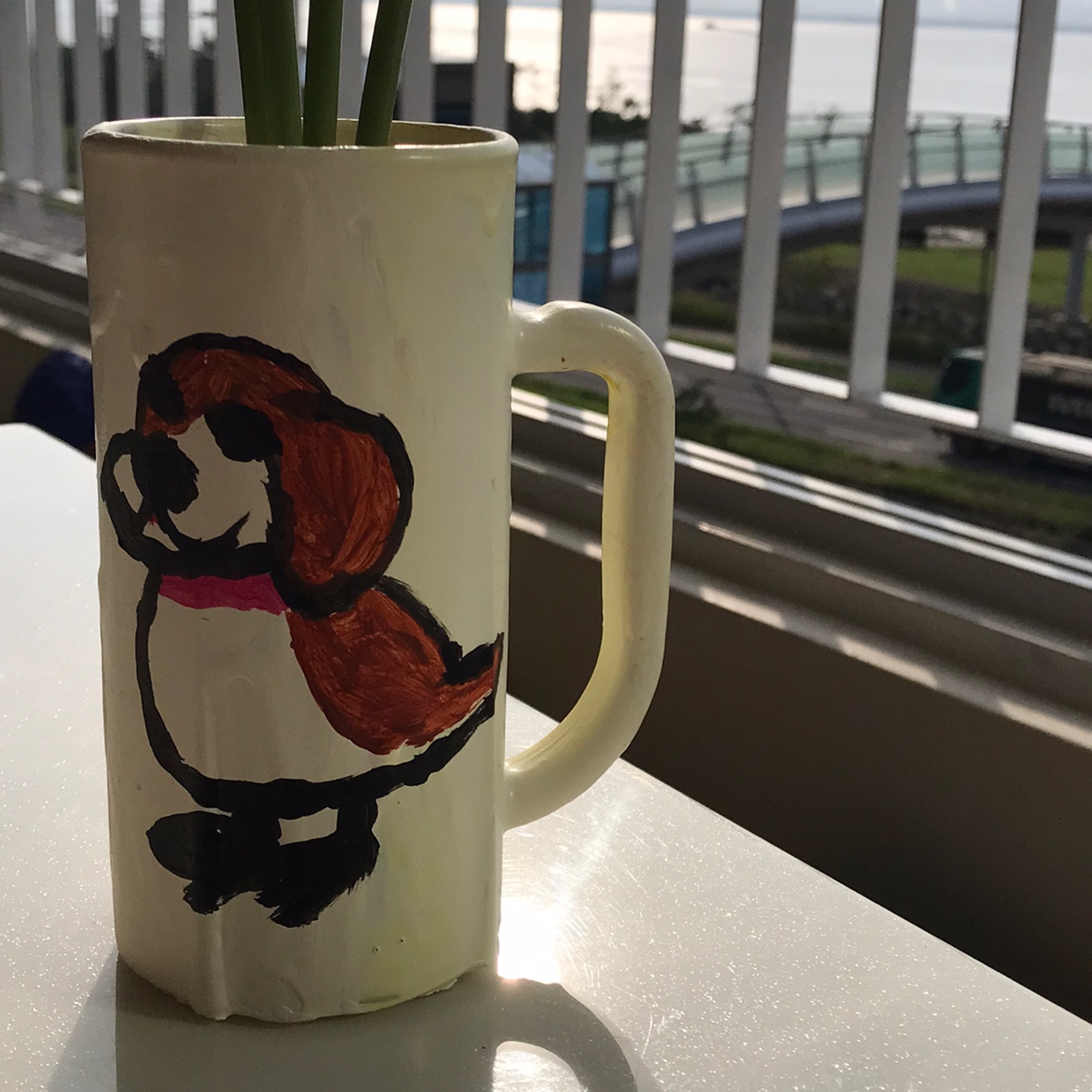 안쪽에 앉았다가 테라스쪽 자리 비었길래 앉았는데 햇빛 직빵으로 와서 좀 더웠음^^,, 좀 앉아있다 나옴 ㅠ (컵에 그려진 귀여운 개새ㅋㅋㅋ)